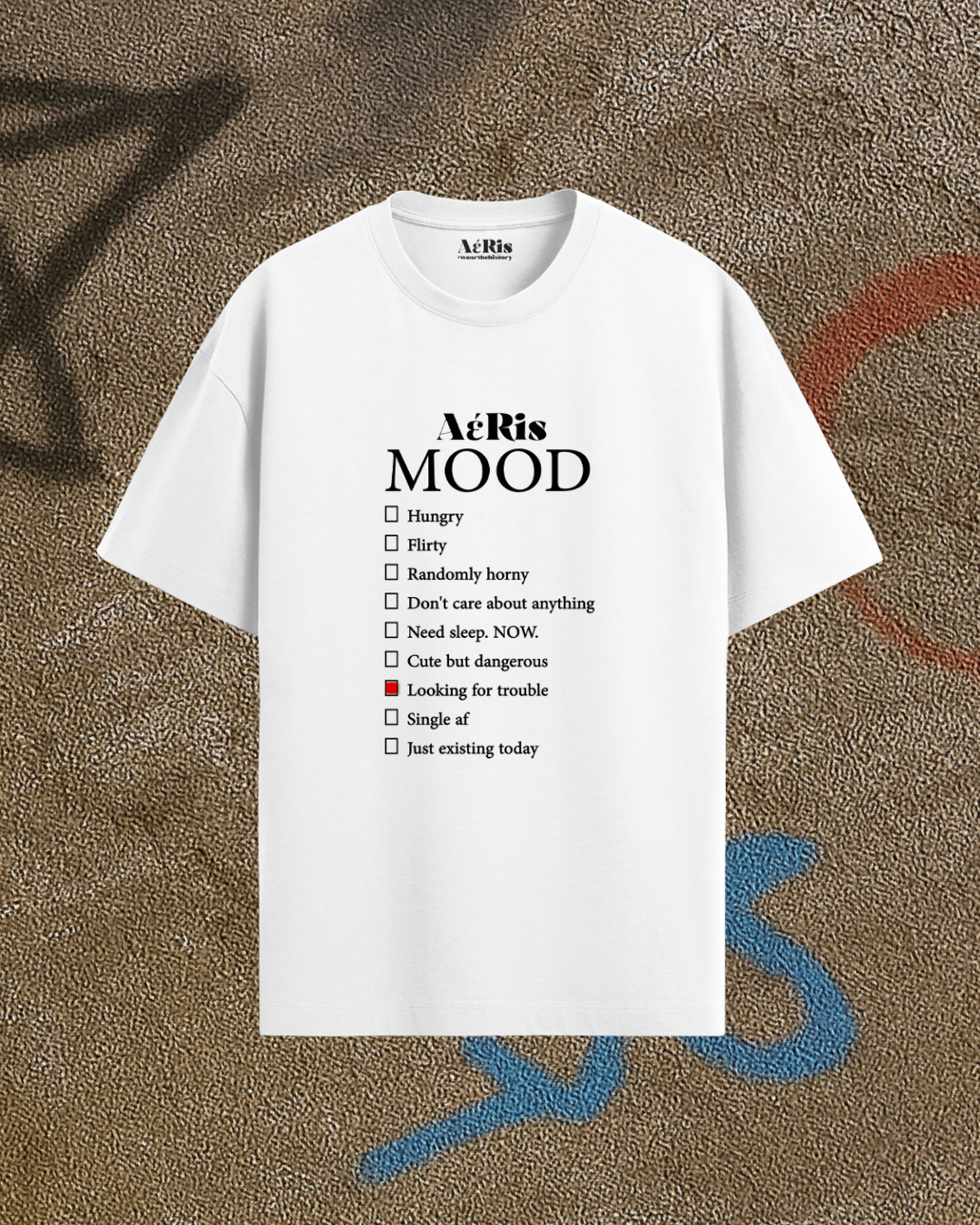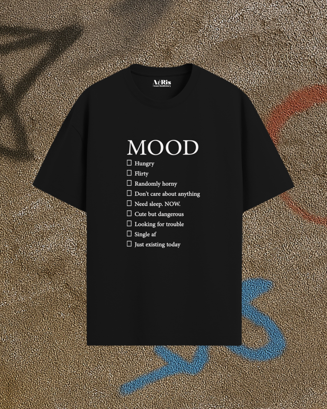Αν υπήρχε τρόπος να περιγράψεις την ψυχολογία σου με ένα μόνο ρούχο, θα ήταν αυτός. Γιατί η αλήθεια είναι απλή: κανείς δεν έχει ένα mood — έχουμε όλα, μέσα στην ίδια μέρα. Το oversized Aeris T-shirt “MOOD” παίζει με αυτή την αλήθεια και τη μετατρέπει σε statement: ένα checklist από vibes που αλλάζουν ανάλογα με την ώρα, τον καφέ, τον ύπνο, το crush και την υπομονή σου. ✔ Hungry ✔ Flirty ✔ Randomly horny ✔ Don’t care about anything ✔ Need sleep. NOW. ✔ Cute but dangerous ✔ Looking for trouble ✔ Single af ✔ Just existing today Ό,τι κι αν είσαι σήμερα… το T-shirt σε έχει καλύψει. Το φοράς και γίνεται instant ice-breaker — όλοι προσπαθούν να μαντέψουν ποιο κουτάκι έχεις τσεκάρει νοερά. Ένα κομμάτι με χιούμορ, αυτοσαρκασμό και απόλυτο AERIS attitude. Γιατί όποιος είπε ότι το στιλ δεν έχει mood… δεν φόρεσε αυτό.